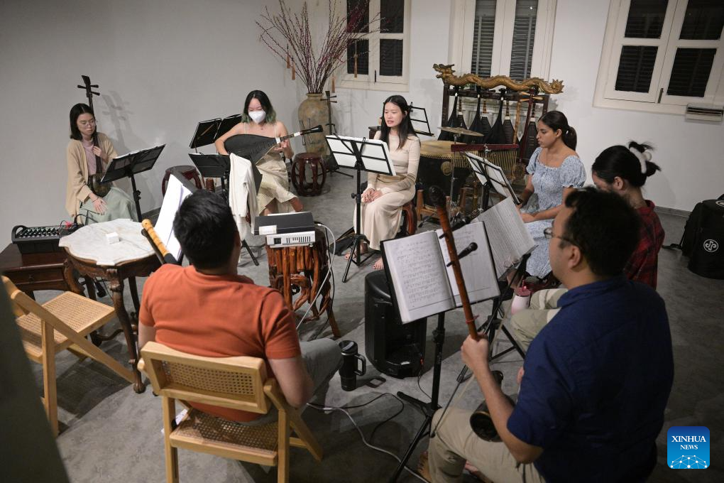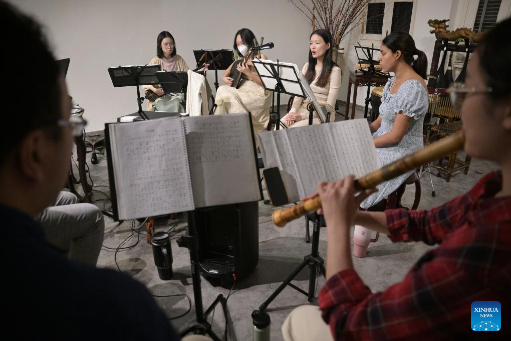 Members of a music society named Siong Leng learn Nanyin in Singapore on Jan. 13, 2025. Nanyin, which originated from southeast China's Fujian Province, is known as the "living fossil" of ancient Chinese music and literally means music in the south. It is a traditional opera in Fujian dialect.