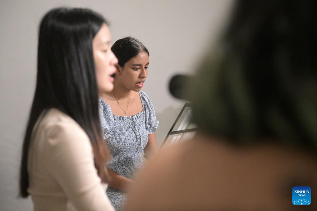 Nadya Tasha Lim (2nd L), a member of a music society named Siong Leng, learns Nanyin in Singapore on Jan. 13, 2025. Nanyin, which originated from southeast China's Fujian Province, is known as the "living fossil" of ancient Chinese music and literally means music in the south. It is a traditional opera in Fujian dialect.
