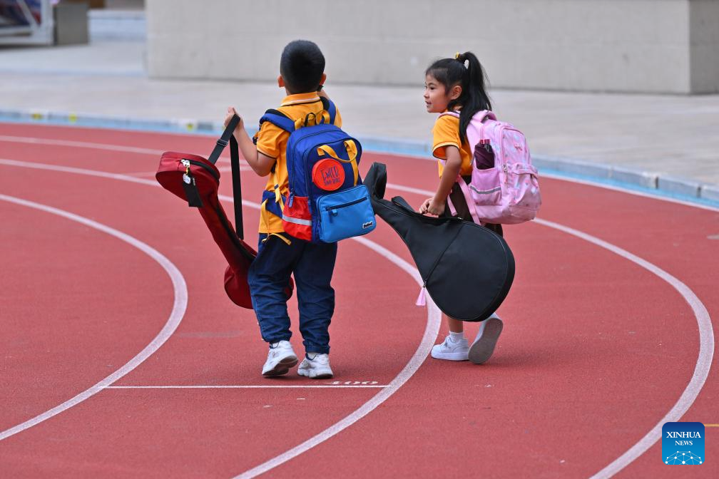Students walk on the playground after a Nanyin class at a primary school in Jinjiang, southeast China's Fujian Province, on Oct. 23, 2025. Nanyin, which originated from southeast China's Fujian Province, is known as the "living fossil" of ancient Chinese music and literally means music in the south. It is a traditional opera in Fujian dialect.