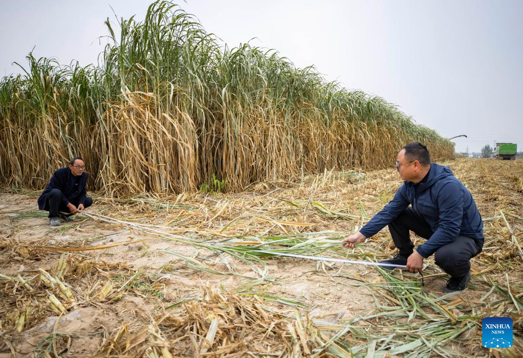 Technicians check the growth of giant Juncao in Minning Town of Yongning County in Yinchuan, northwest China's Ningxia Hui Autonomous Region, Oct. 23, 2025. Giant Juncao cultivated in Minning Town of Yongning County has recently entered the harvest season. The harvested giant Juncao will be used as silage to support the development of the cattle and sheep breeding industry. (Xinhua/Yang Zhisen)
