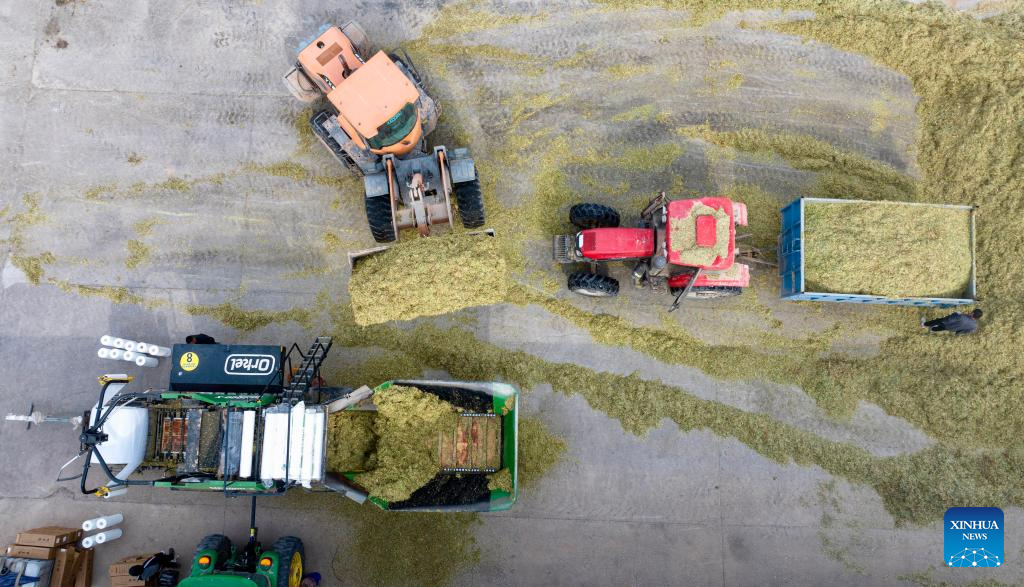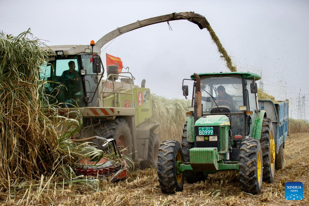 This photo taken on Oct. 23, 2025 shows farmers operating agricultural machines to harvest giant Juncao in Minning Town of Yongning County in Yinchuan, northwest China's Ningxia Hui Autonomous Region. Giant Juncao cultivated in Minning Town of Yongning County has recently entered the harvest season. The harvested giant Juncao will be used as silage to support the development of the cattle and sheep breeding industry. (Xinhua/Yang Zhisen)