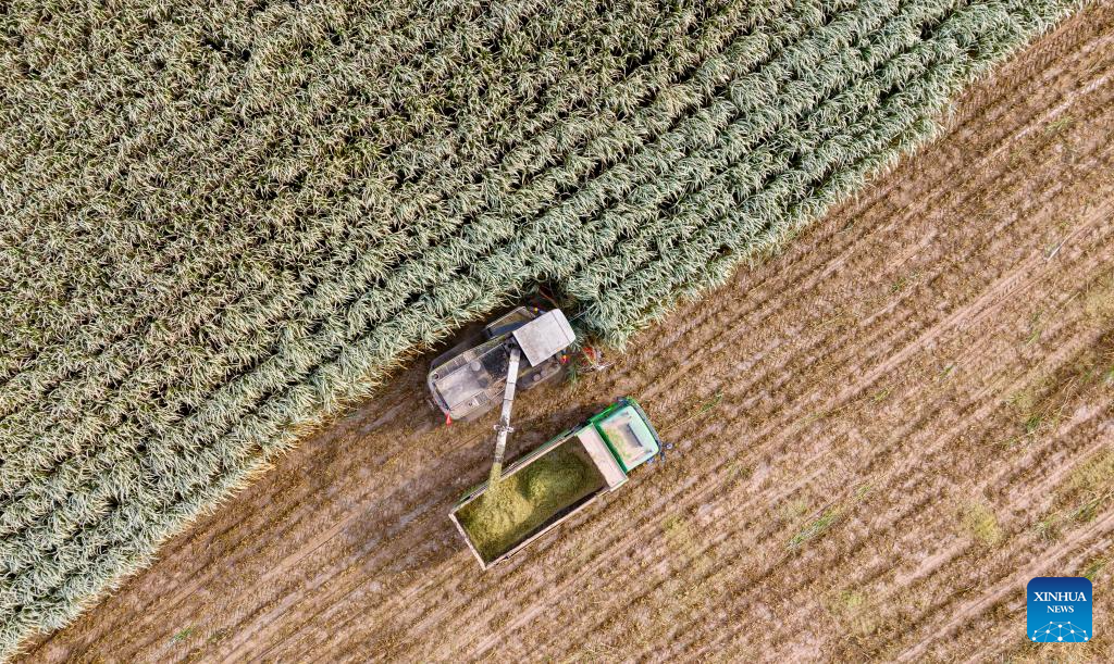 An aerial drone photo taken on Oct. 23, 2025 shows farmers operating agricultural machines to harvest giant Juncao in Minning Town of Yongning County in Yinchuan, northwest China's Ningxia Hui Autonomous Region. Giant Juncao cultivated in Minning Town of Yongning County has recently entered the harvest season. The harvested giant Juncao will be used as silage to support the development of the cattle and sheep breeding industry. (Xinhua/Yang Zhisen)