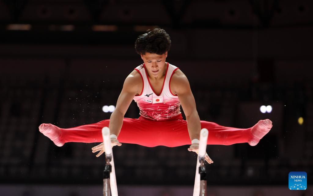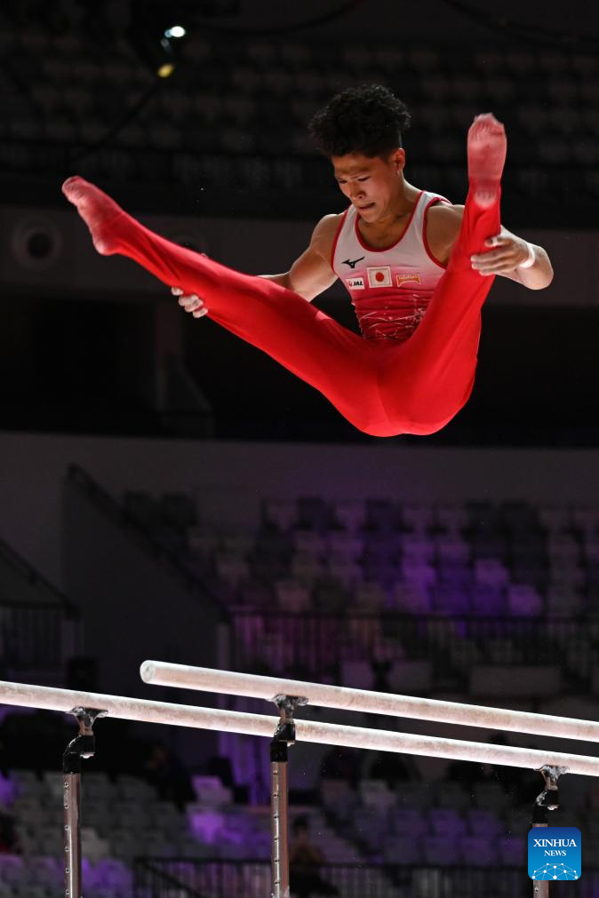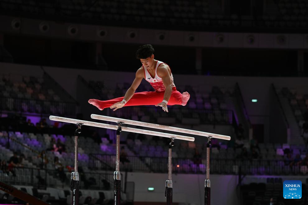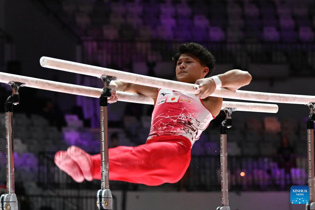 Tsunogai Tomoharu of Japan competes during the men's Parallel Bars Final at 53rd FIG Artistic Gymnastics World Championships in Jakarta, Indonesia, on Oct. 25, 2025. (Xinhua/Bai Xuefei)