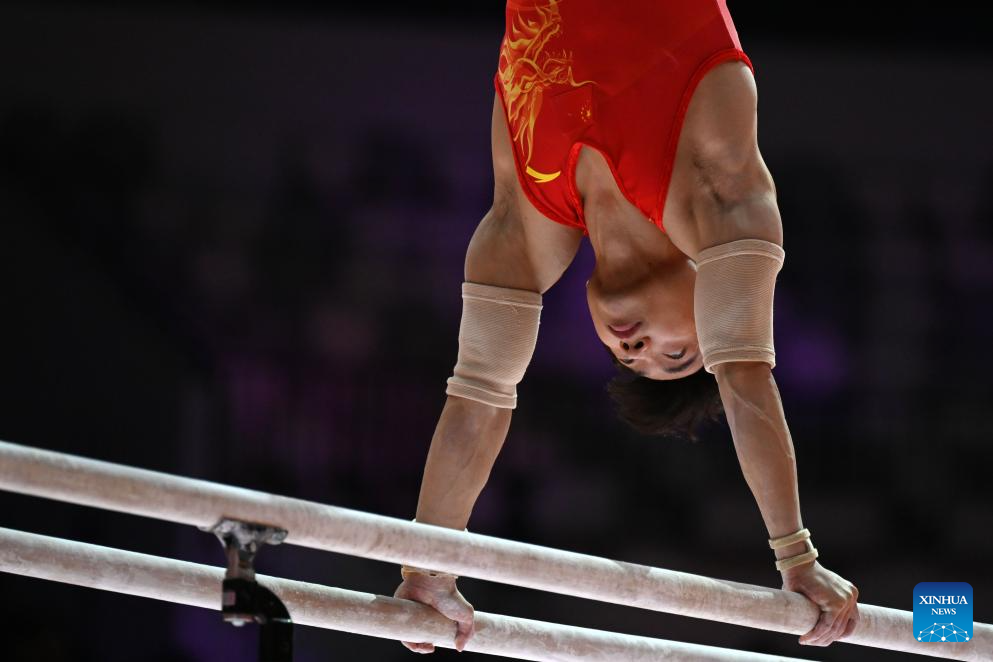 Zou Jingyuan of China competes during the men's Parallel Bars Final at 53rd FIG Artistic Gymnastics World Championships in Jakarta, Indonesia, on Oct. 25, 2025. (Xinhua/Agung Kuncahya B.)