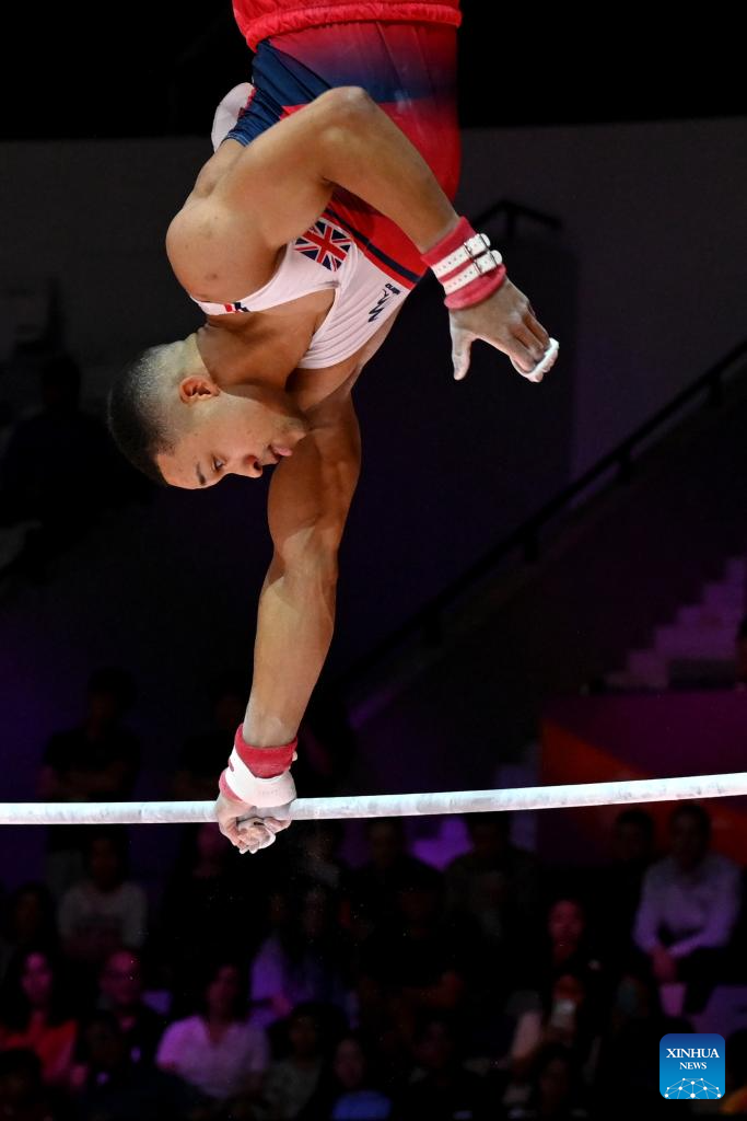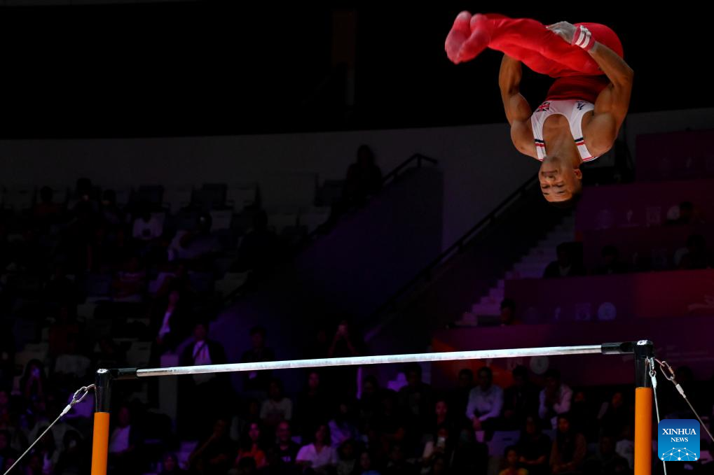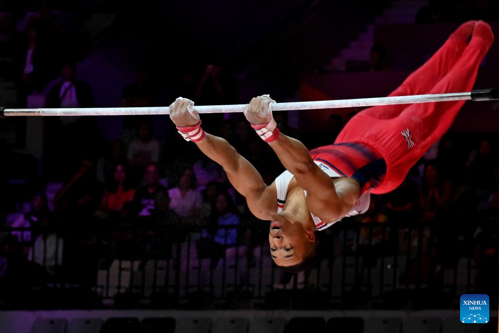 Joe Fraser of Britain competes during the men's Horizontal Bar Final at 53rd FIG Artistic Gymnastics World Championships in Jakarta, Indonesia, on Oct. 25, 2025. (Xinhua/Bai Xuefei)