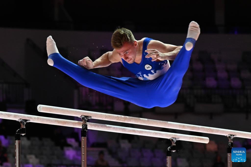 Daniel Marinov of AIN (Individual Neutral Athlete) competes during the men's Parallel Bars Final at 53rd FIG Artistic Gymnastics World Championships in Jakarta, Indonesia, on Oct. 25, 2025. (Xinhua/Bai Xuefei)