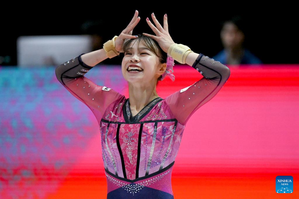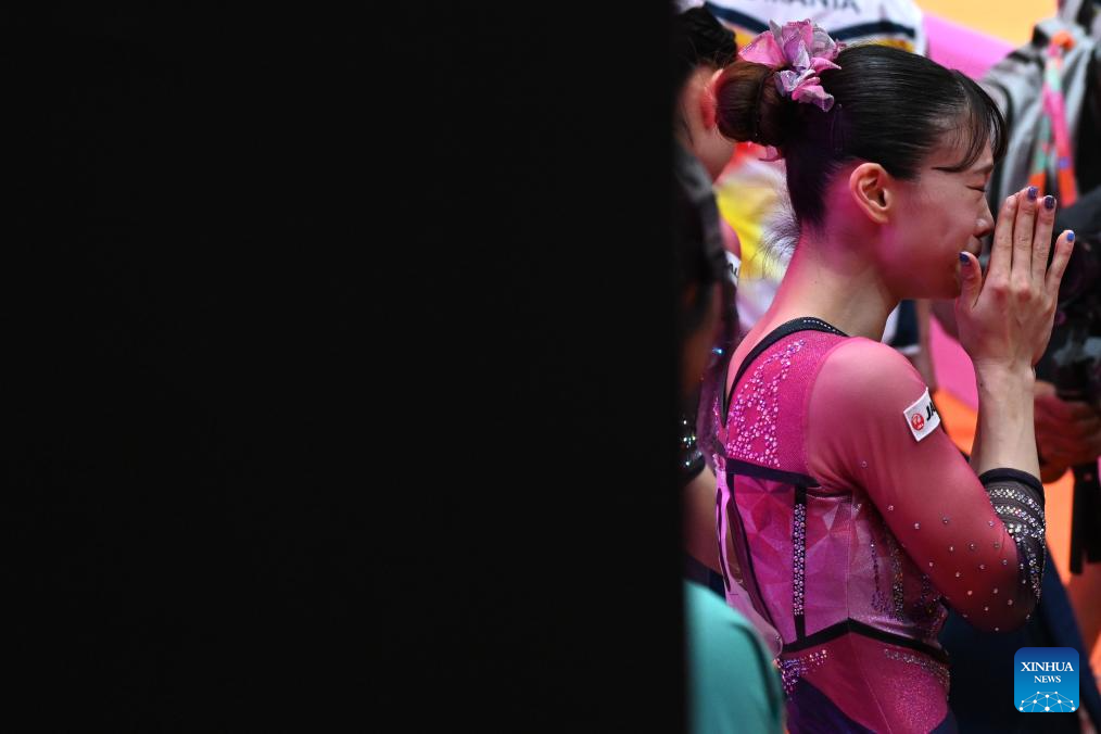 Sugihara Aiko of Japan reacts after the women's Floor Exercise Final at 53rd FIG Artistic Gymnastics World Championships in Jakarta, Indonesia, on Oct. 25, 2025. (Xinhua/Agung Kuncahya B.)