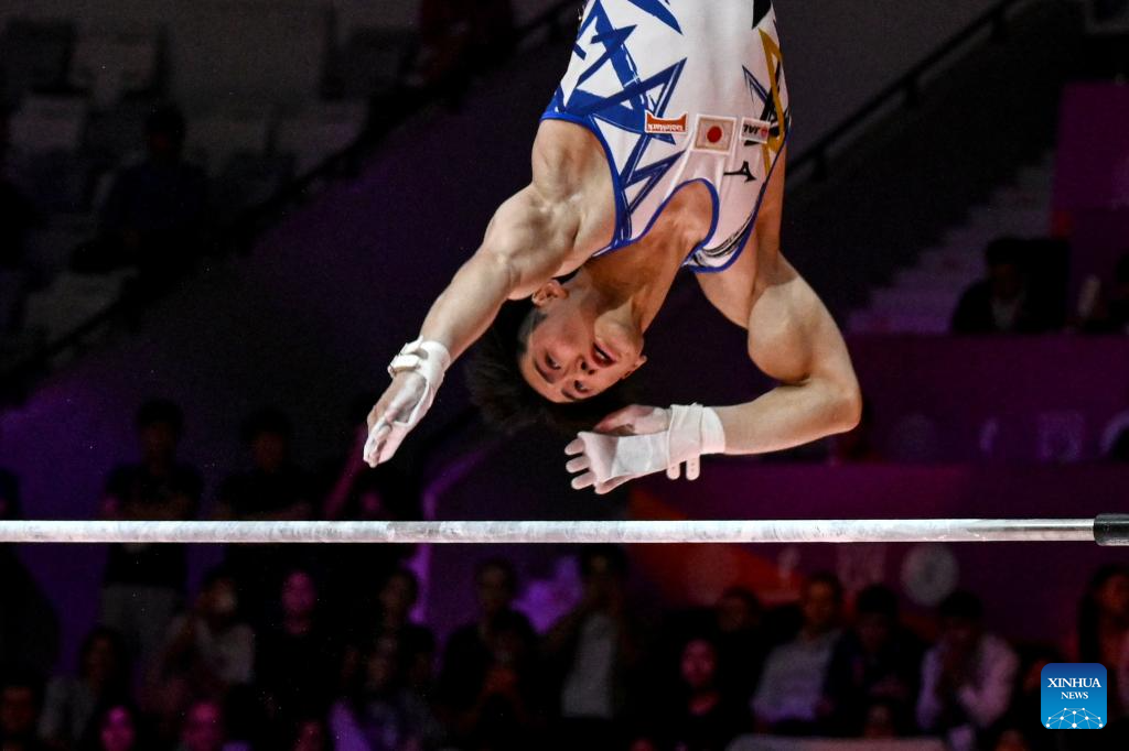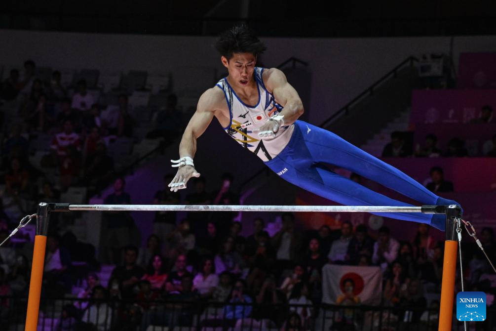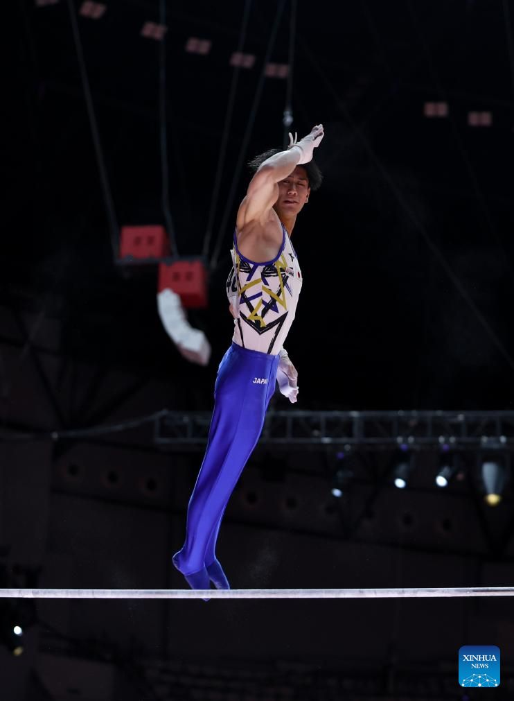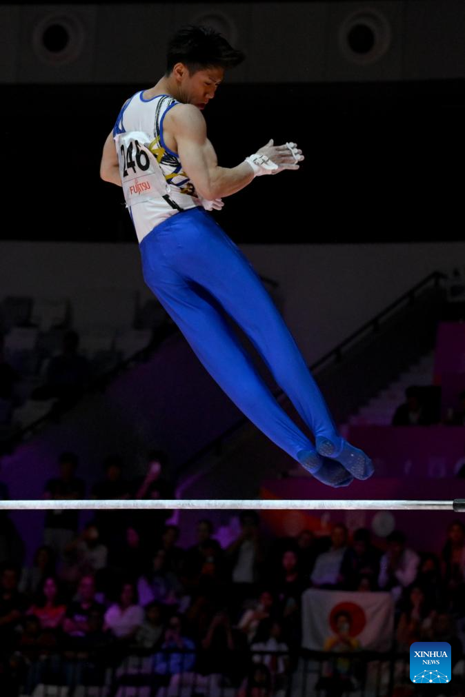 Hashimoto Daiki of Japan competes during the men's Horizontal Bar Final at 53rd FIG Artistic Gymnastics World Championships in Jakarta, Indonesia, on Oct. 25, 2025. (Xinhua/Bai Xuefei)