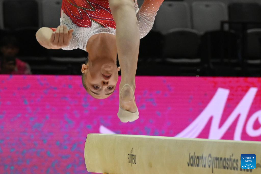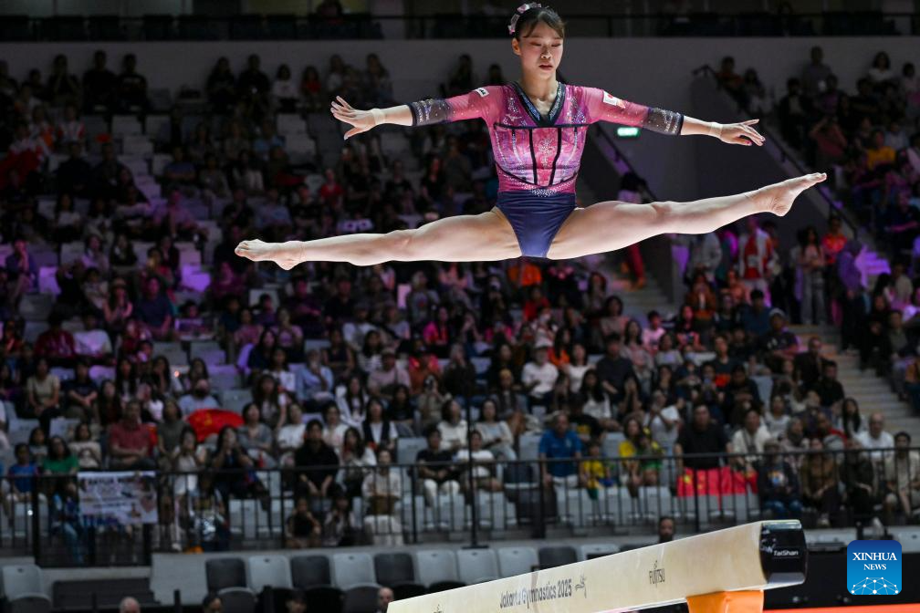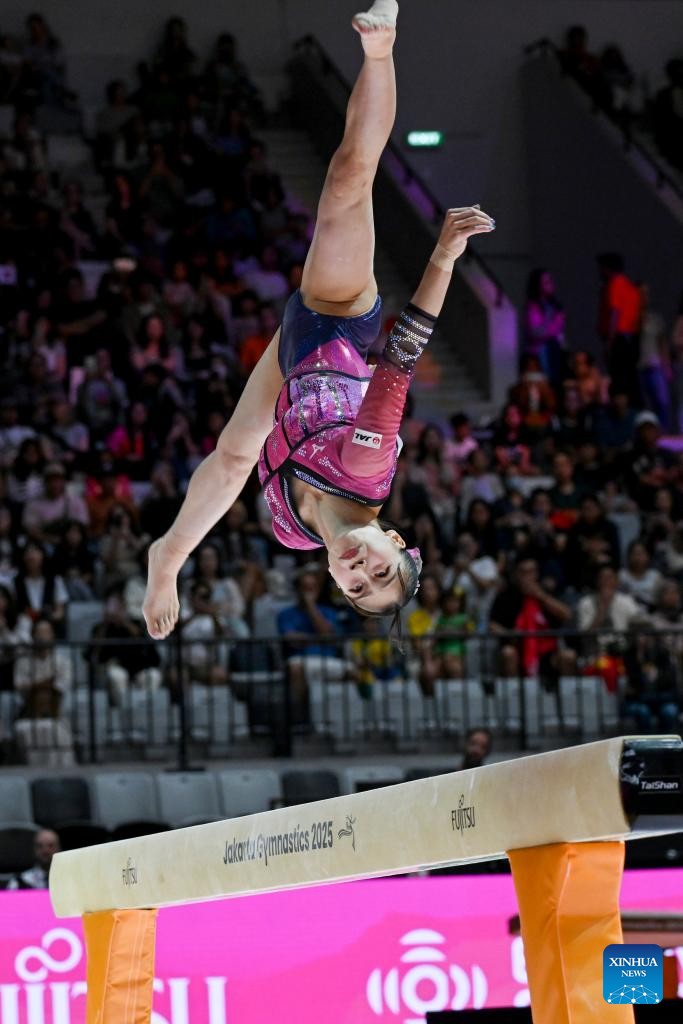 Sugihara Aiko of Japan competes during the women's Balance Beam Final at 53rd FIG Artistic Gymnastics World Championships in Jakarta, Indonesia, on Oct. 25, 2025. (Xinhua/Agung Kuncahya B.)