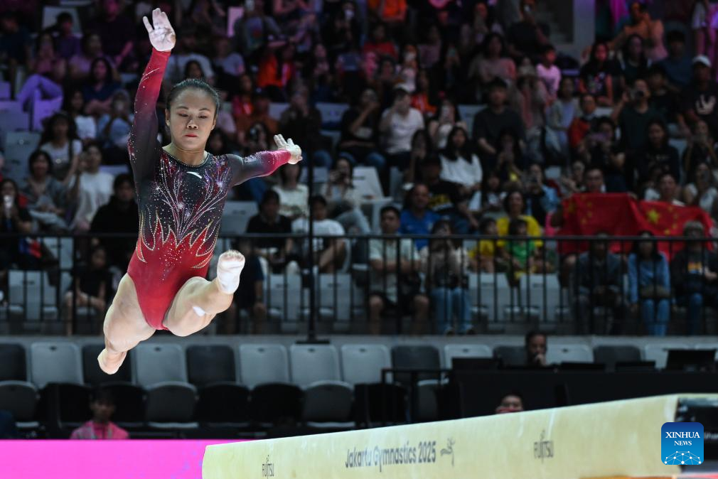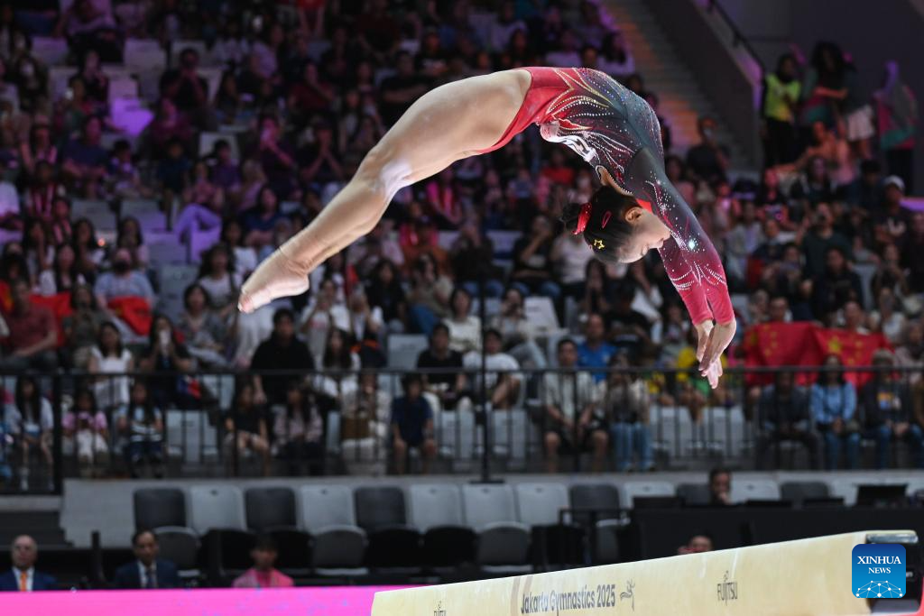 Zhang Qingying of China competes during the women's Balance Beam Final at 53rd FIG Artistic Gymnastics World Championships in Jakarta, Indonesia, on Oct. 25, 2025. (Xinhua/Agung Kuncahya B.)