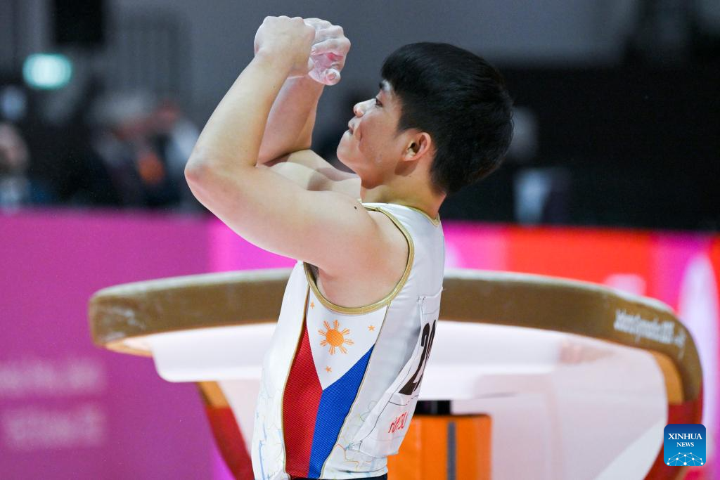 Carlos Edriel Yulo of the Philippines reacts during the men's Vault Final at 53rd FIG Artistic Gymnastics World Championships in Jakarta, Indonesia, on Oct. 25, 2025. (Xinhua/Agung Kuncahya B.)