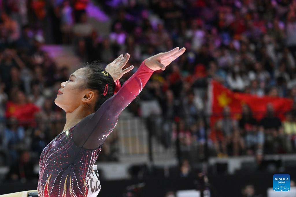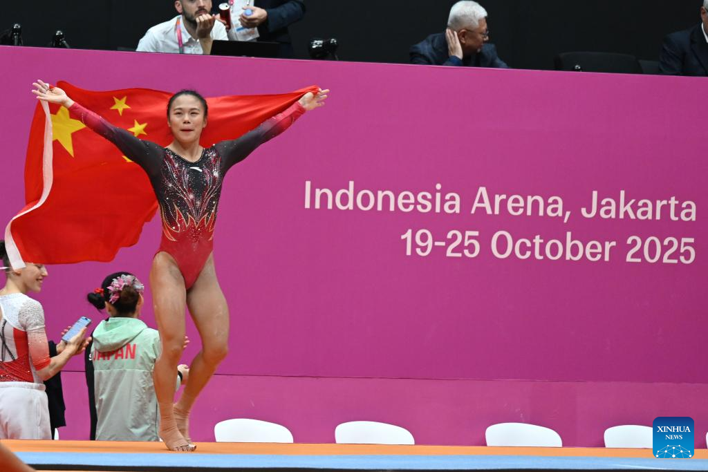 Zhang Qingying of China celebrates after the women's Balance Beam Final at 53rd FIG Artistic Gymnastics World Championships in Jakarta, Indonesia, on Oct. 25, 2025. (Xinhua/Agung Kuncahya B.)