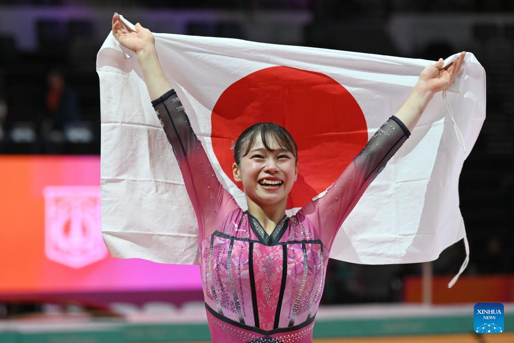 Sugihara Aiko of Japan celebrates after the women's Floor Exercise Final at 53rd FIG Artistic Gymnastics World Championships in Jakarta, Indonesia, on Oct. 25, 2025. (Xinhua/Agung Kuncahya B.)