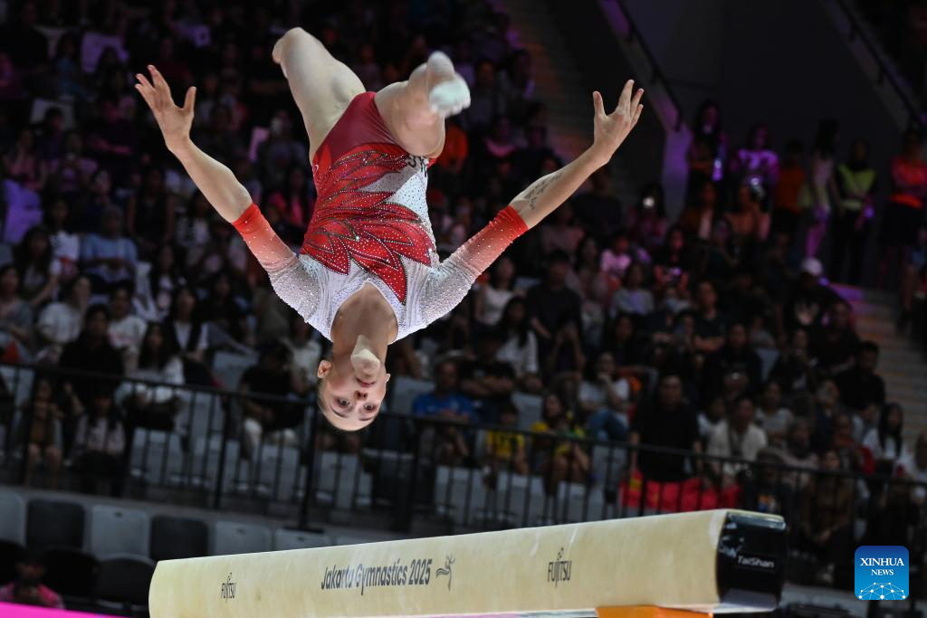 Kaylia Nemour of Algeria competes during the women's Balance Beam Final at 53rd FIG Artistic Gymnastics World Championships in Jakarta, Indonesia, on Oct. 25, 2025. (Xinhua/Agung Kuncahya B.)
