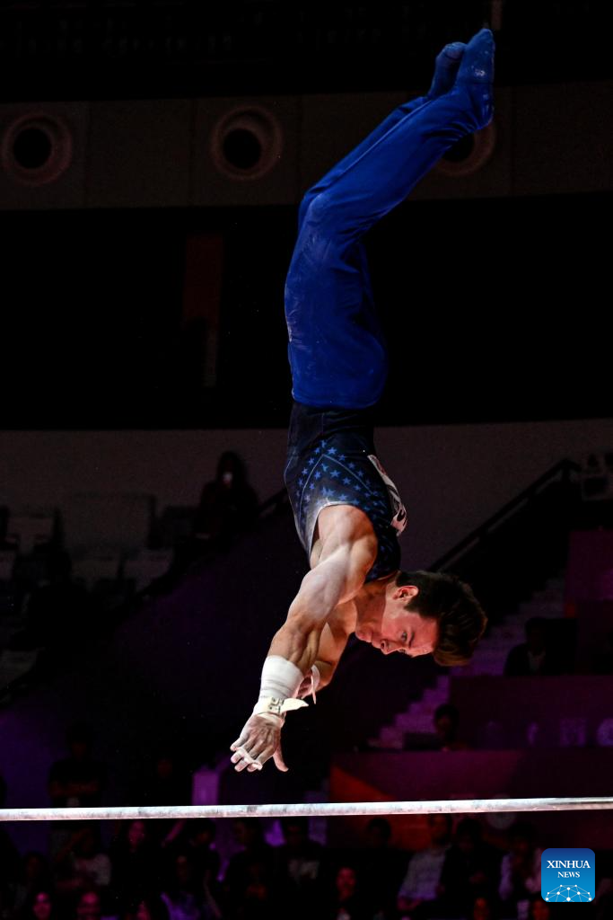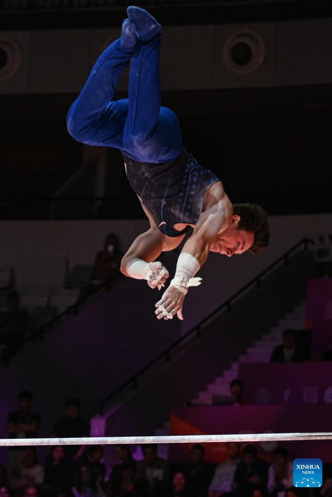 Brody Malone of the United States competes during the men's Horizontal Bar Final at 53rd FIG Artistic Gymnastics World Championships in Jakarta, Indonesia, on Oct. 25, 2025. (Xinhua/Bai Xuefei)