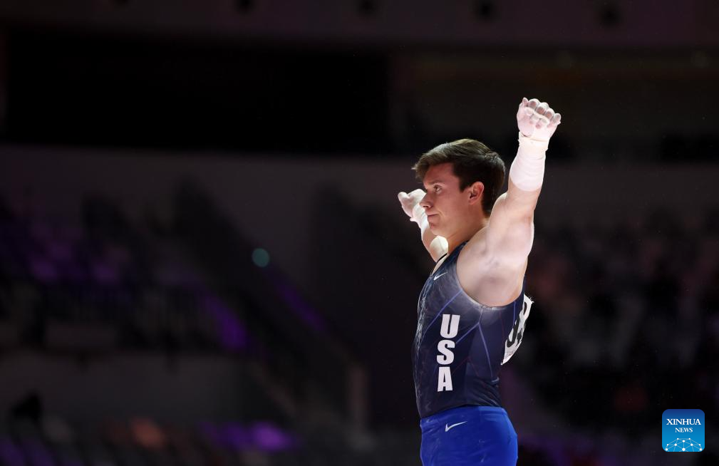 Brody Malone of the United States reacts during the men's Horizontal Bar Final at 53rd FIG Artistic Gymnastics World Championships in Jakarta, Indonesia, on Oct. 25, 2025. (Xinhua/Bai Xuefei)
