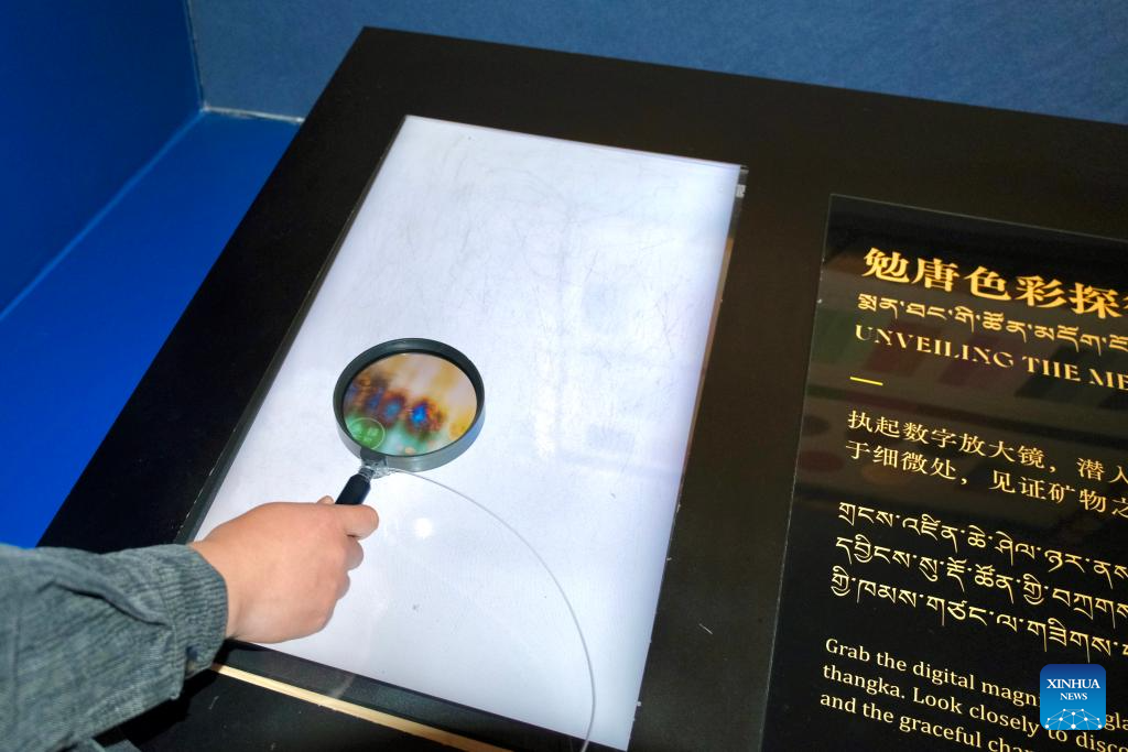 This photo taken on Oct. 21, 2025 shows an interactive device at a thangka art exhibition in the Xizang Museum in Lhasa, southwest China's Xizang Autonomous Region. (Xinhua/Zhou Yulong)
