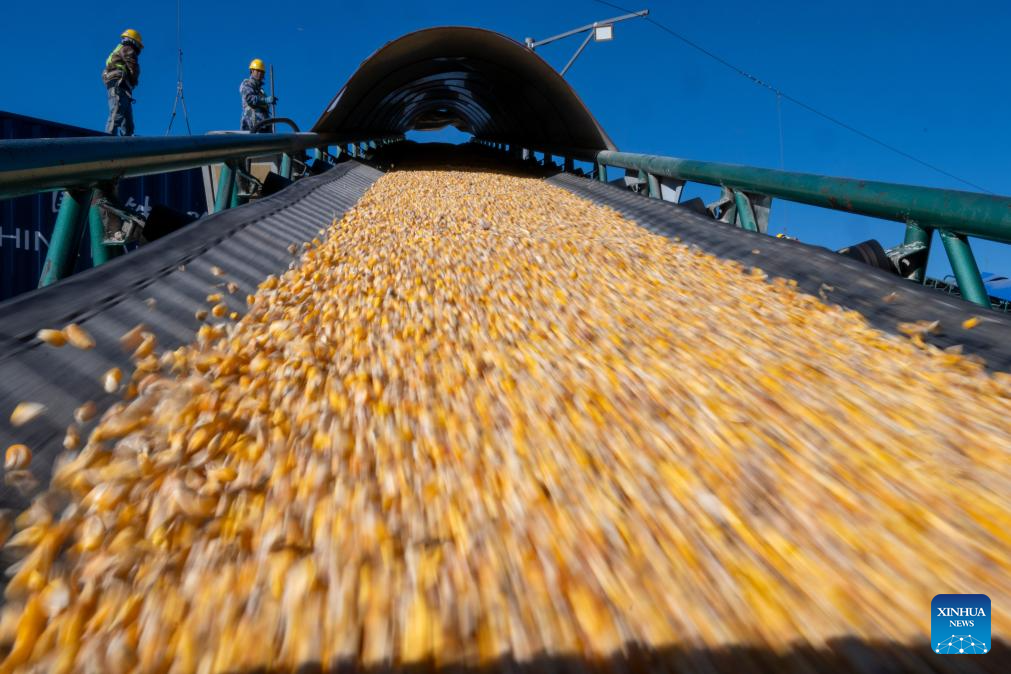 Workers conduct loading operations at a logistics park of China's leading food trader China Oil and FoodStuffs Corporation in Shuangyashan City, northeast China's Heilongjiang Province, Oct. 31, 2025. As Heilongjiang, one of China's major grain-producing province, has recently entered a busy period of grain transportation, China Railway Harbin Group Co., Ltd. has built an efficient and collaborative multimodal transport system, and established a connection mechanism with grain production enterprises in advance, to promote cost reduction, quality improvement and efficiency enhancement of the grain transportation. (Xinhua/Zhang Tao)