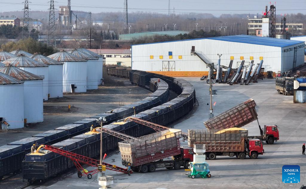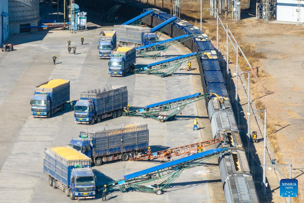 An aerial drone photo taken on Oct. 31, 2025 shows workers conducting loading operations at a logistics park of China's leading food trader China Oil and FoodStuffs Corporation in Shuangyashan City, northeast China's Heilongjiang Province. As Heilongjiang, one of China's major grain-producing province, has recently entered a busy period of grain transportation, China Railway Harbin Group Co., Ltd. has built an efficient and collaborative multimodal transport system, and established a connection mechanism with grain production enterprises in advance, to promote cost reduction, quality improvement and efficiency enhancement of the grain transportation. (Xinhua/Zhang Tao)