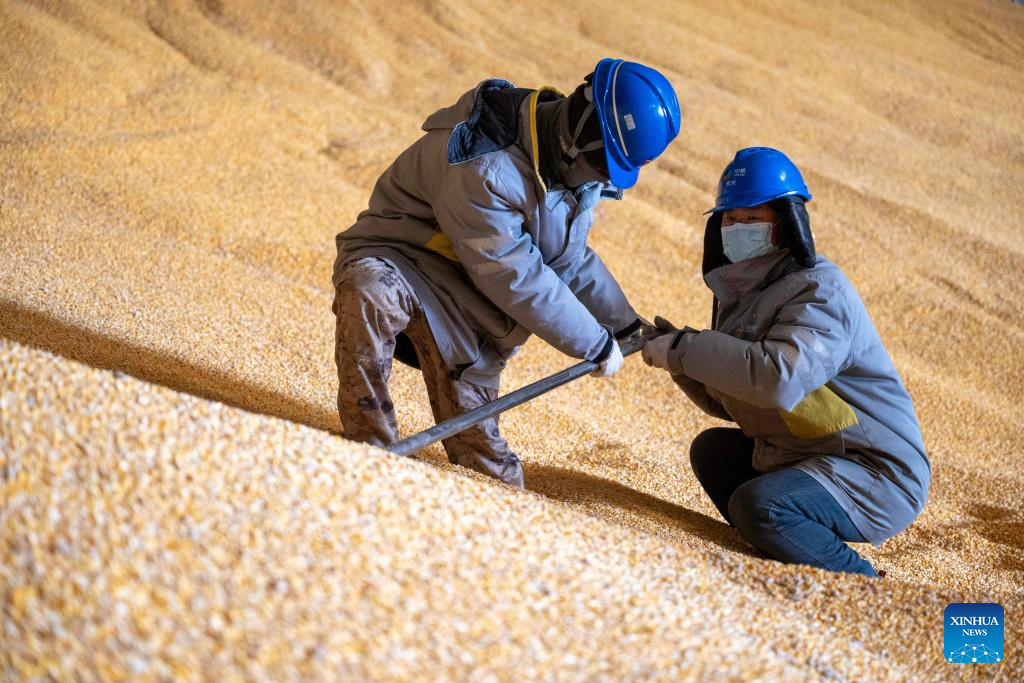 Workers conduct sampling operations at a storage warehouse in a logistics park of China's leading food trader China Oil and FoodStuffs Corporation in Shuangyashan City, northeast China's Heilongjiang Province, Oct. 31, 2025. As Heilongjiang, one of China's major grain-producing province, has recently entered a busy period of grain transportation, China Railway Harbin Group Co., Ltd. has built an efficient and collaborative multimodal transport system, and established a connection mechanism with grain production enterprises in advance, to promote cost reduction, quality improvement and efficiency enhancement of the grain transportation. (Xinhua/Zhang Tao)