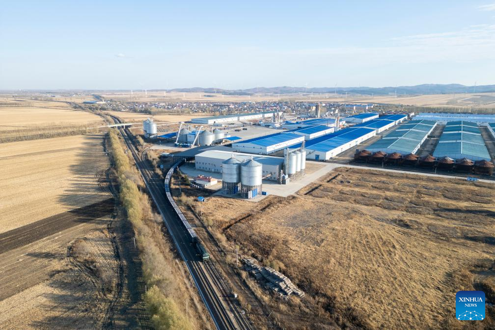 An aerial drone photo taken on Oct. 31, 2025 shows a freight train departing a logistics park of China's leading food trader China Oil and FoodStuffs Corporation in Shuangyashan City, northeast China's Heilongjiang Province. As Heilongjiang, one of China's major grain-producing province, has recently entered a busy period of grain transportation, China Railway Harbin Group Co., Ltd. has built an efficient and collaborative multimodal transport system, and established a connection mechanism with grain production enterprises in advance, to promote cost reduction, quality improvement and efficiency enhancement of the grain transportation. (Xinhua/Zhang Tao)