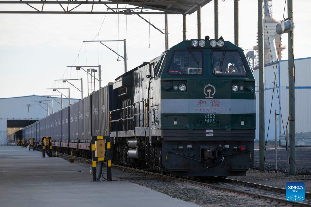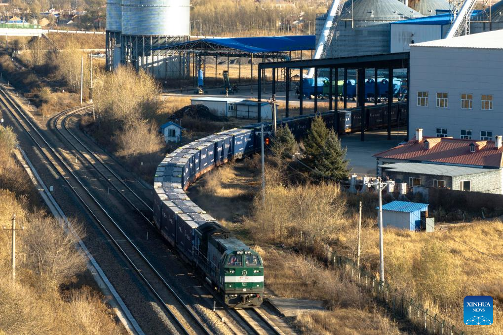 A loaded freight train is ready to depart a logistics park of China's leading food trader China Oil and FoodStuffs Corporation in Shuangyashan City, northeast China's Heilongjiang Province, Oct. 31, 2025. As Heilongjiang, one of China's major grain-producing province, has recently entered a busy period of grain transportation, China Railway Harbin Group Co., Ltd. has built an efficient and collaborative multimodal transport system, and established a connection mechanism with grain production enterprises in advance, to promote cost reduction, quality improvement and efficiency enhancement of the grain transportation. (Xinhua/Zhang Tao)