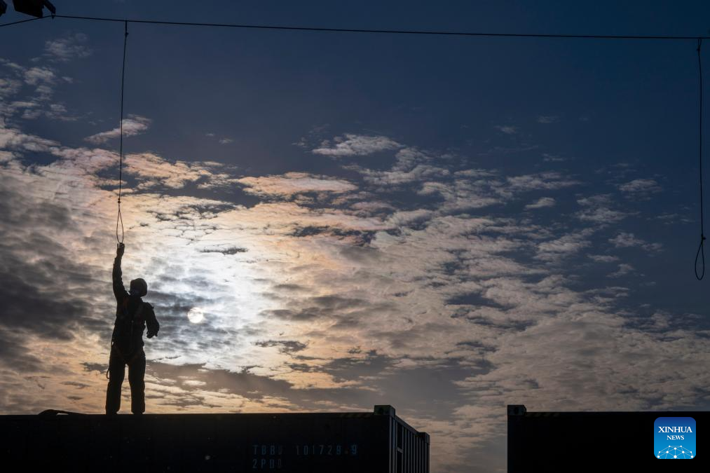 A worker conducts loading operations at a logistics park of China's leading food trader China Oil and FoodStuffs Corporation in Shuangyashan City, northeast China's Heilongjiang Province, Oct. 31, 2025. As Heilongjiang, one of China's major grain-producing province, has recently entered a busy period of grain transportation, China Railway Harbin Group Co., Ltd. has built an efficient and collaborative multimodal transport system, and established a connection mechanism with grain production enterprises in advance, to promote cost reduction, quality improvement and efficiency enhancement of the grain transportation. (Xinhua/Zhang Tao)