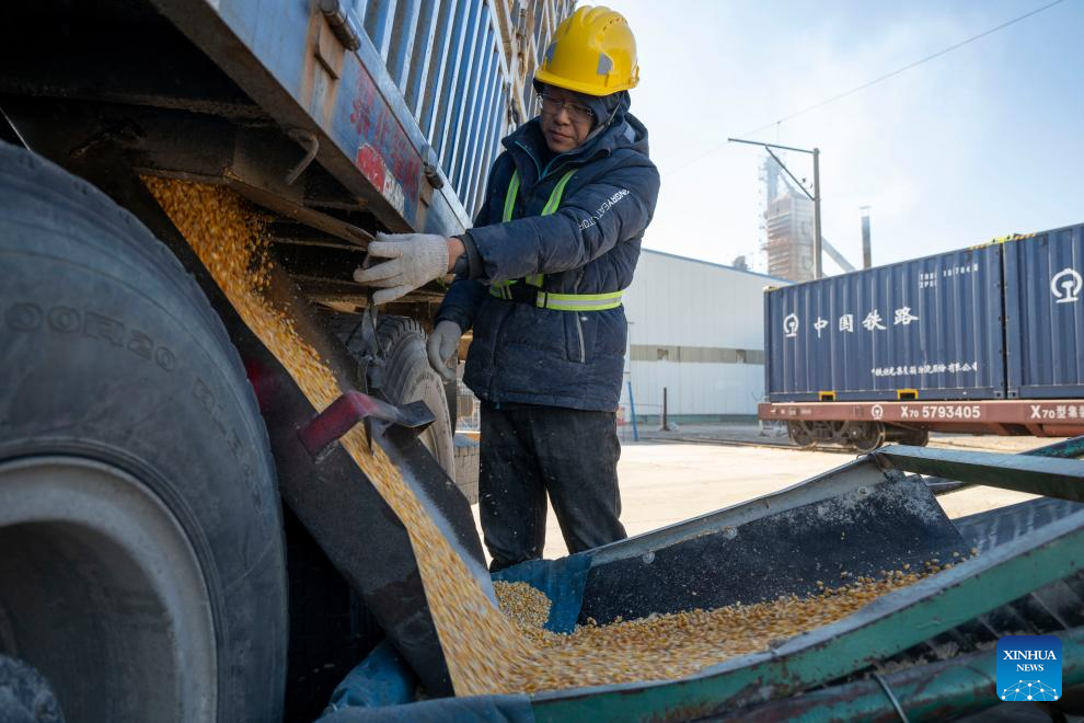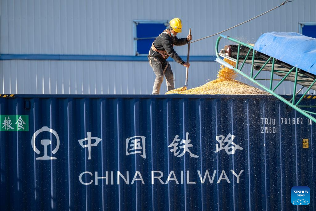 A worker loads grain at a logistics park of China's leading food trader China Oil and FoodStuffs Corporation in Shuangyashan City, northeast China's Heilongjiang Province, Oct. 31, 2025. As Heilongjiang, one of China's major grain-producing province, has recently entered a busy period of grain transportation, China Railway Harbin Group Co., Ltd. has built an efficient and collaborative multimodal transport system, and established a connection mechanism with grain production enterprises in advance, to promote cost reduction, quality improvement and efficiency enhancement of the grain transportation. (Xinhua/Zhang Tao)