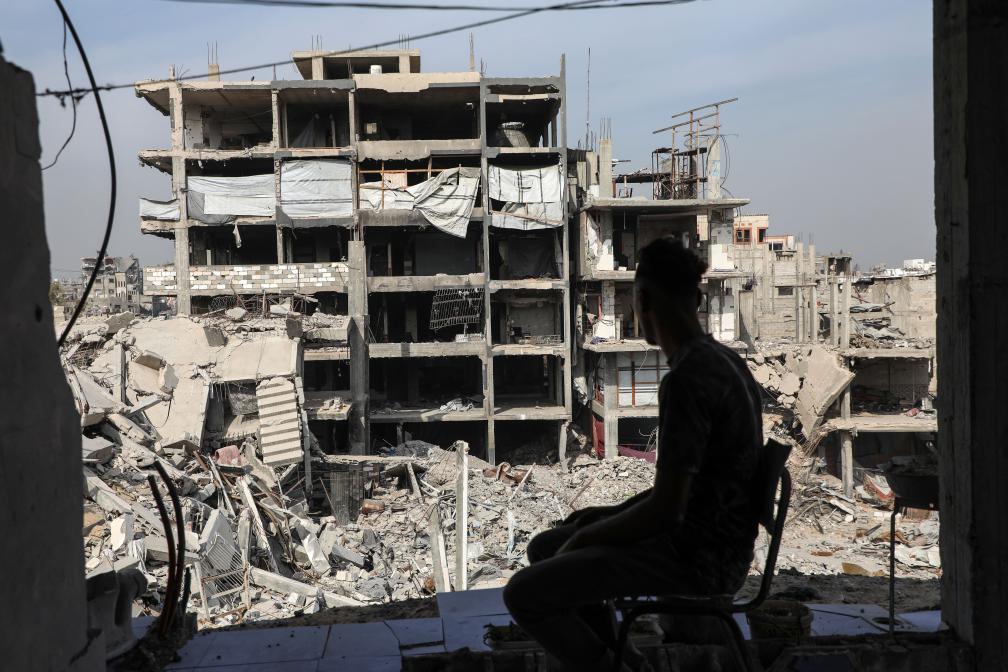 A Palestinian sits in a destroyed building in the Jabalia refugee camp in northern Gaza on Nov. 2, 2025. (Photo by Rizek Abdeljawad/Xinhua)