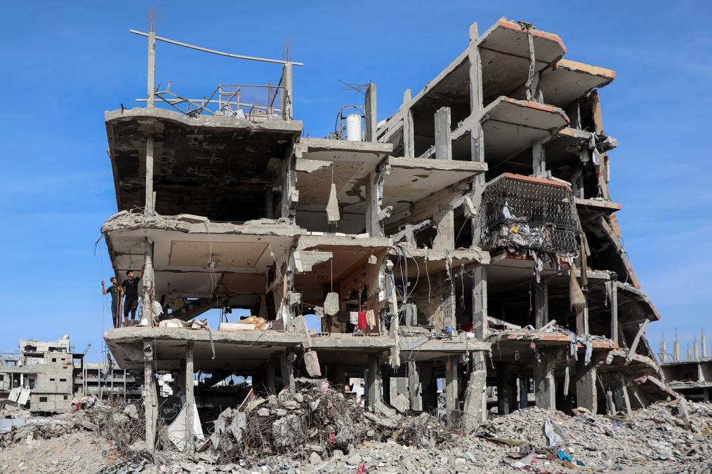 Palestinians stand in a destroyed building in the Jabalia refugee camp in northern Gaza on Nov. 2, 2025. (Photo by Rizek Abdeljawad/Xinhua)