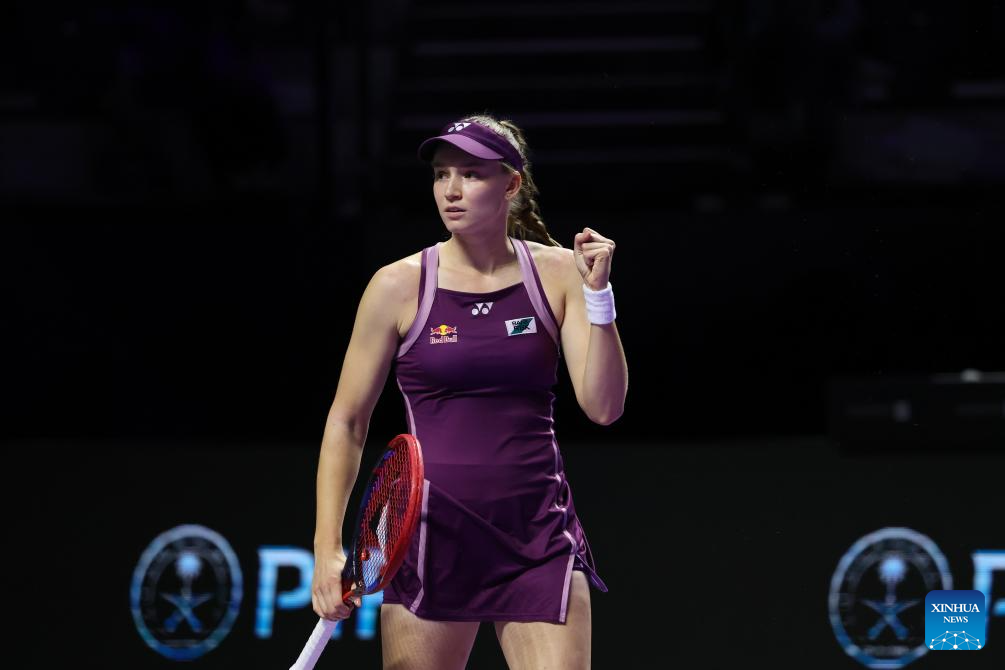 Elena Rybakina of Kazakhstan celebrates for winning the round robin match against Iga Swiatek of Poland at WTA Finals tennis tournament in Riyadh, Saudi Arabia, on Nov. 3, 2025. (Xinhua/Luo Chen)