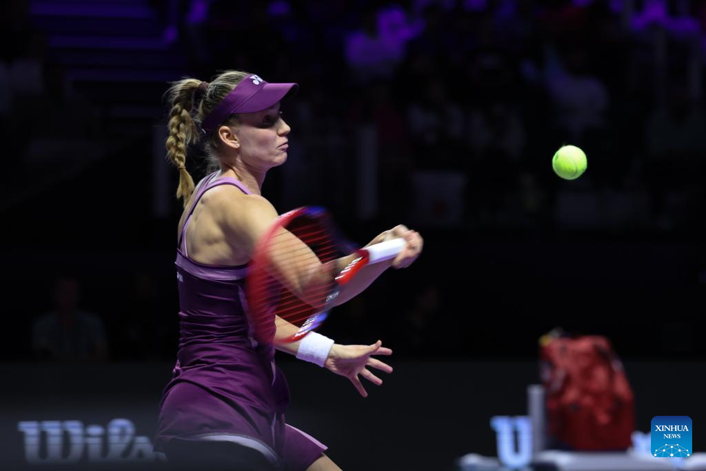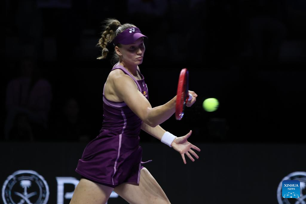Elena Rybakina of Kazakhstan returns a ball during the round robin match against Iga Swiatek of Poland at WTA Finals tennis tournament in Riyadh, Saudi Arabia, on Nov. 3, 2025. (Xinhua/Luo Chen)