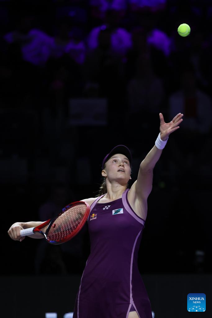 Elena Rybakina of Kazakhstan serves during the round robin match against Iga Swiatek of Poland at WTA Finals tennis tournament in Riyadh, Saudi Arabia, on Nov. 3, 2025. (Xinhua/Luo Chen)