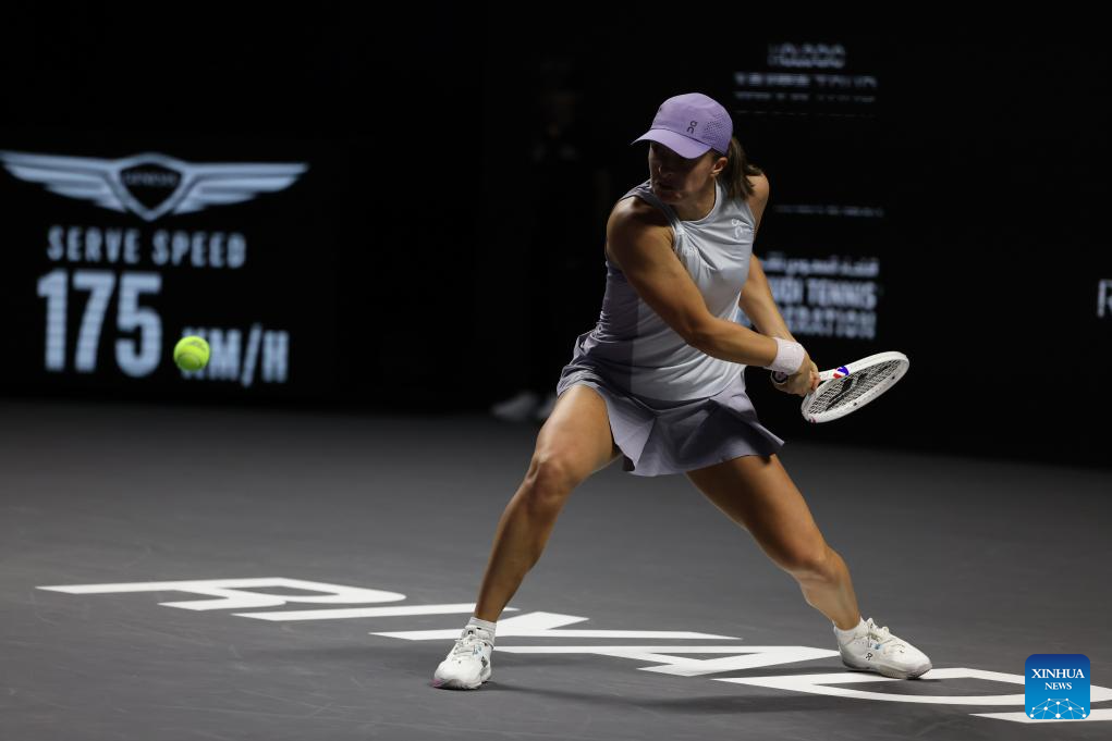 Iga Swiatek of Poland returns a ball during the round robin match against Elena Rybakina of Kazakhstan at WTA Finals tennis tournament in Riyadh, Saudi Arabia, on Nov. 3, 2025. (Xinhua/Luo Chen)