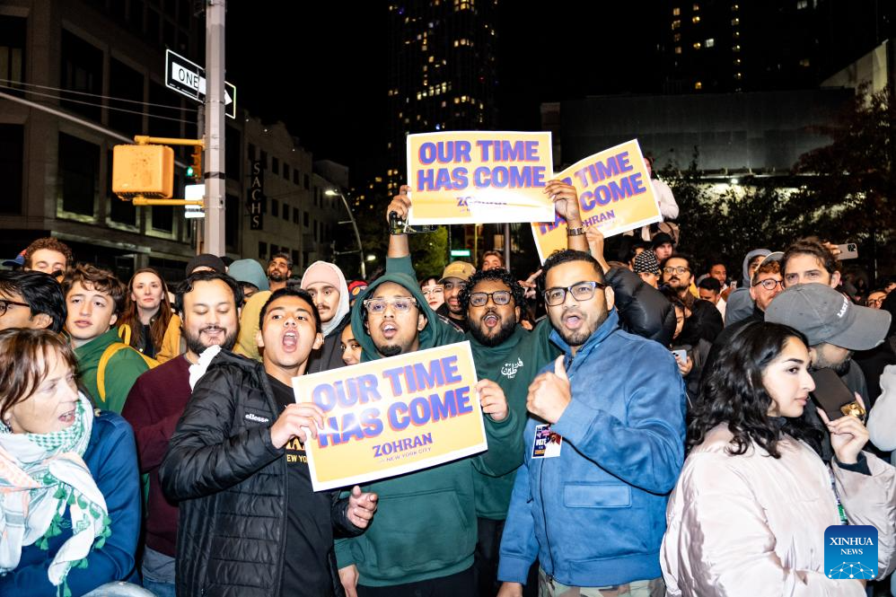 Supporters celebrate after Democratic candidate Zohran Mamdani winning the New York City mayoral election in New York City, the United States, Nov. 4, 2025. Democratic candidate Zohran Mamdani won the New York City mayoral election Tuesday night, becoming the first muslim mayor of the most populous city in the United States. (Photo by Zack Zhang/Xinhua)