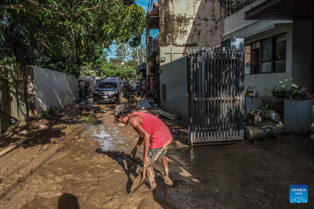 A resident clears the mud after the massive flood brought by typhoon Kalmaegi in Cebu Province, the Philippines, Nov. 5, 2025. Typhoon Kalmaegi left the Philippines before dawn Thursday with 114 deaths and at least 127 missing mainly in the central Philippines, the Office of Civil Defense (OCD) said. (Str/Xinhua)