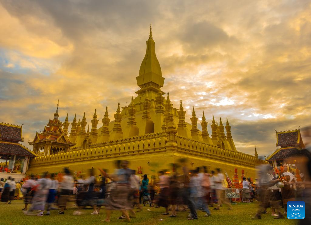 People participate in activities in celebration of the That Luang festival in Vientiane, Laos, Nov. 4, 2025. The annual That Luang festival has begun in the Lao capital Vientiane, ushering in five days of vibrant celebration, spiritual devotion, and bustling commerce that not only reflect the rich traditions of Laos but also boost tourism and trade opportunities. (Photo by Kaikeo Saiyasane/Xinhua)