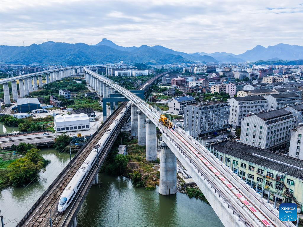 An aerial drone photo shows workers operating at the track laying construction site of the Wenling-Yuhuan section of Hangzhou-Taizhou high-speed railway in Taizhou, east China's Zhejiang Province, Nov. 5, 2025. (Xinhua/Xu Yu)