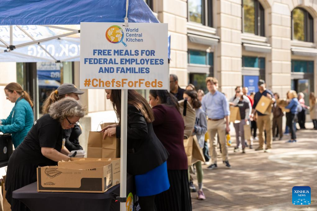 Federal employees receive free meals at a free food distribution stall in Washington, D.C., the United States, Nov. 5, 2025. On Wednesday, the U.S. federal government shutdown entered its 36th day, surpassing the previous 35-day record set during the 2018-2019 shutdown, making it the longest government shutdown in U.S. history. (Xinhua/Hu Yousong)