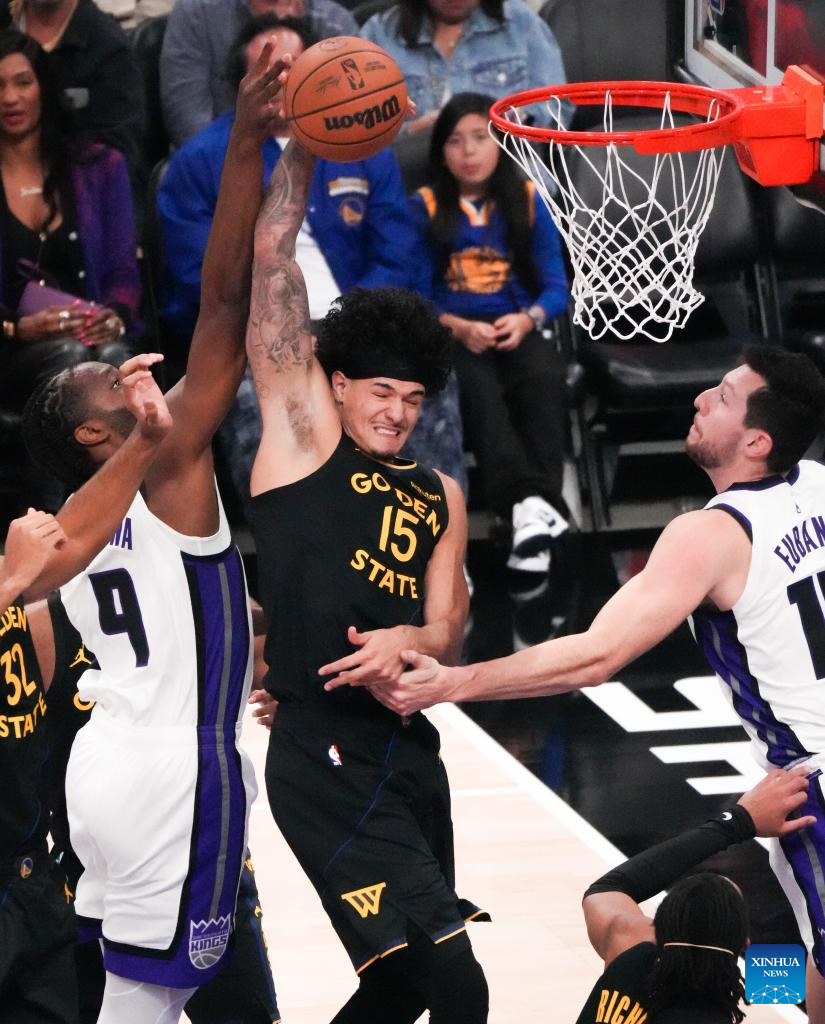 Gui Santos (C) of Golden State Warriors vies for the ball during the 2025-2026 NBA regular season match between Sacramento Kings and Golden State Warriors in Sacramento, the United States, Nov. 5, 2025. (Photo by Sun Yuxuan/Xinhua)