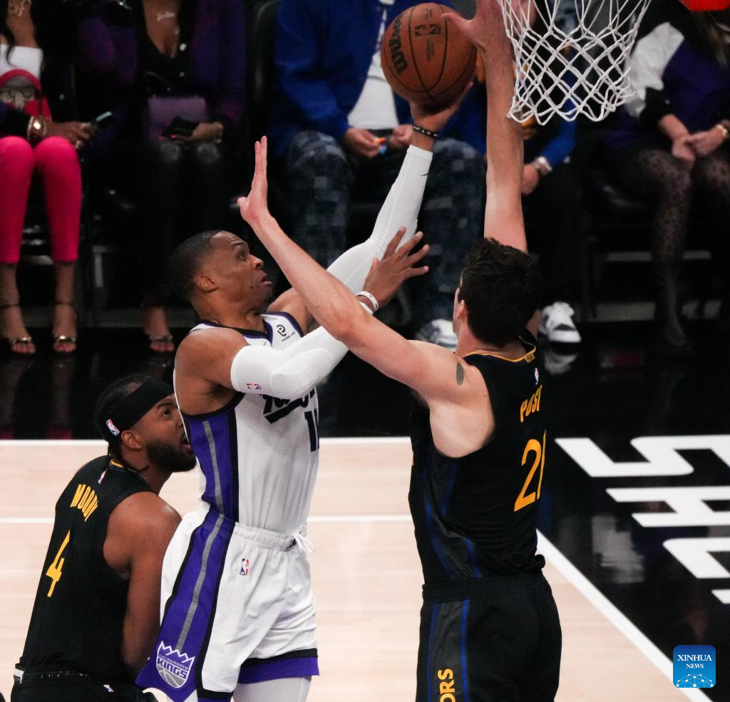 Russell Westbrook (C) of Sacramento Kings goes for a layup during the 2025-2026 NBA regular season match between Sacramento Kings and Golden State Warriors in Sacramento, the United States, Nov. 5, 2025. (Photo by Sun Yuxuan/Xinhua)