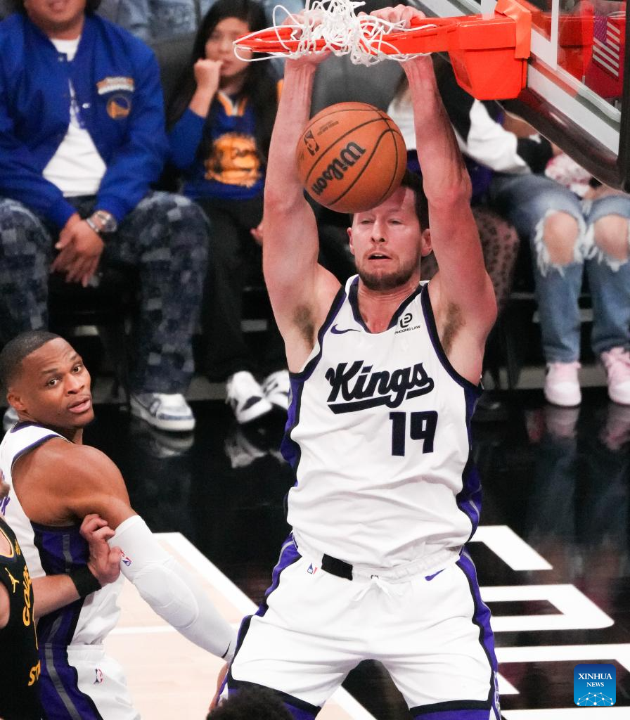 Drew Eubanks (R) of Sacramento Kings dunks during the 2025-2026 NBA regular season match between Sacramento Kings and Golden State Warriors in Sacramento, the United States, Nov. 5, 2025. (Photo by Sun Yuxuan/Xinhua)