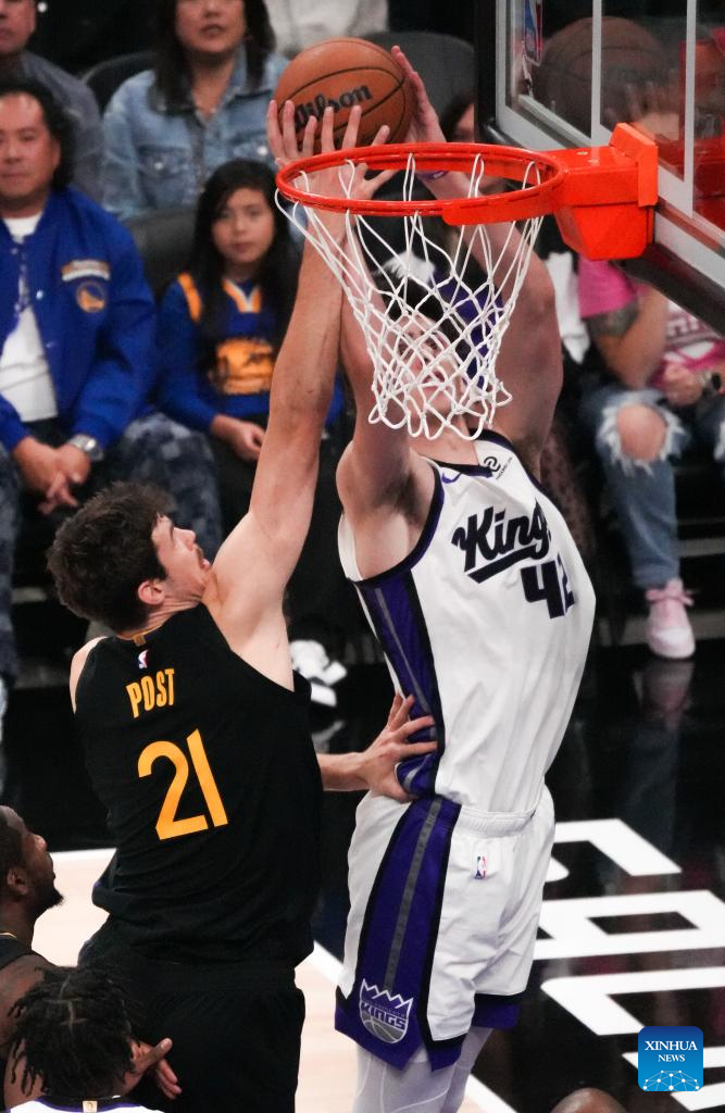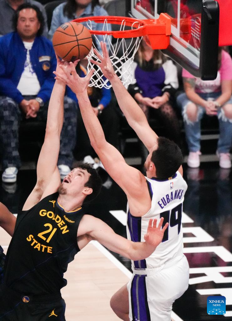 Quinten Post (L) of Golden State Warriors defends during the 2025-2026 NBA regular season match between Sacramento Kings and Golden State Warriors in Sacramento, the United States, Nov. 5, 2025. (Photo by Sun Yuxuan/Xinhua)