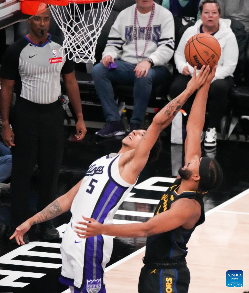 Moses Moody (R) of Golden State Warriors vies for the ball during the 2025-2026 NBA regular season match between Sacramento Kings and Golden State Warriors in Sacramento, the United States, Nov. 5, 2025. (Photo by Sun Yuxuan/Xinhua)