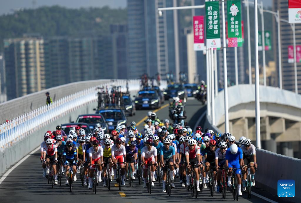 Athletes compete during the men's road race of cycling road at China's 15th National Games in Zhuhai, south China's Guangdong Province, Nov. 8, 2025. (Xinhua/Lian Zhen)