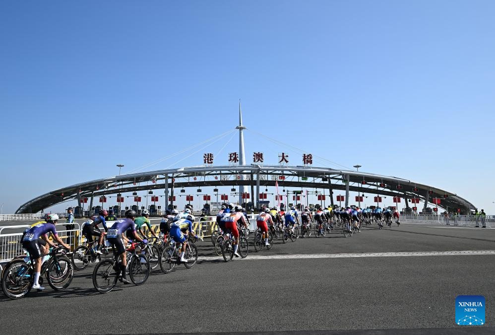 (251108) -- HONG KONG, Nov. 8, 2025 (Xinhua) -- Cyclists compete across the Hong Kong-Zhuhai-Macao Bridge during the men's road race of cycling road at China's 15th National Games in Hong Kong, south China, Nov. 8, 2025. (Xinhua/Zhu Wei)