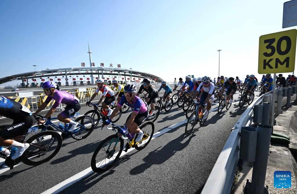 Cyclists compete across the Hong Kong-Zhuhai-Macao Bridge during the men's road race of cycling road at China's 15th National Games in south China's Guangdong Province, Nov. 8, 2025. (Xinhua/Lian Zhen)