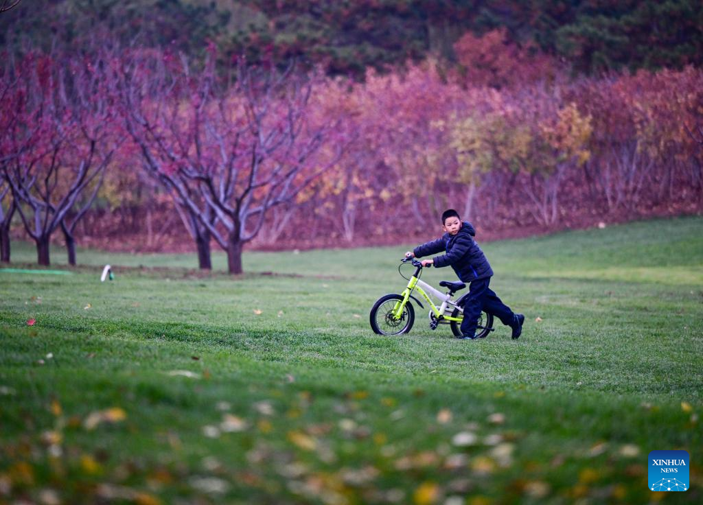 A child walks with his bicycle on a grassland near the Yanqi Lake in Huairou District of Beijing, capital of China, Nov. 8, 2025. (Xinhua/Chen Yehua)