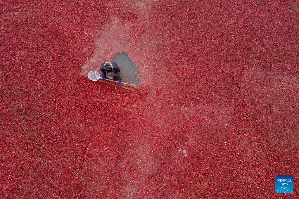 An aerial drone photo taken on Nov. 6, 2025 shows a staff member harvesting cranberries at a cranberry planting base in Fuyuan City, northeast China's Heilongjiang Province.