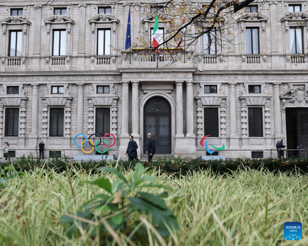 People walk past the emblems of Olympic and Paralympic Games in front of the City Hall of Milan in Milan, Italy, Oct. 29, 2025. The Milan-Cortina 2026 Olympic Winter Games will open on February 6, 2026 at Milan's San Siro Stadium. (Xinhua/Li Jing)